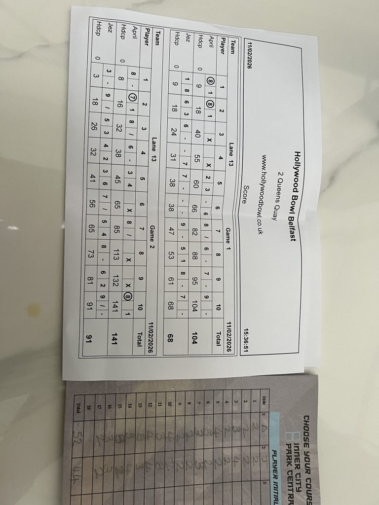 Our last day saw us battling with a very rainy day and a long wait for our plane home. So we did what any self respecting adults do, we slept in, played crazy golf and went bowling. Followed by tea and cake. All in all a varied and enjoyable few days away. Yes, he kicked my butt at golf and I returned the favour with bowling!